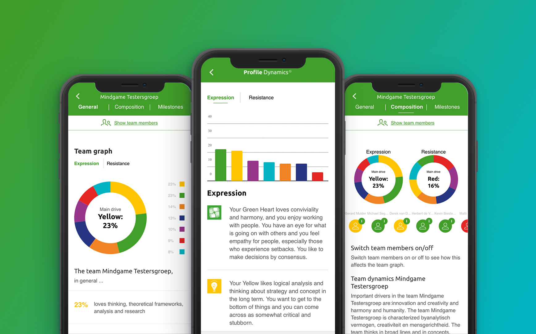 The motivation test provides an extensive profile, which gives people insight into what suits them, what they enjoy and what does not. In order to easily compare profiles within a team, to always have profiles at hand and to optimize coaching, Mindgame and Profile Dynamics have developed the Profile Dynamics app.
