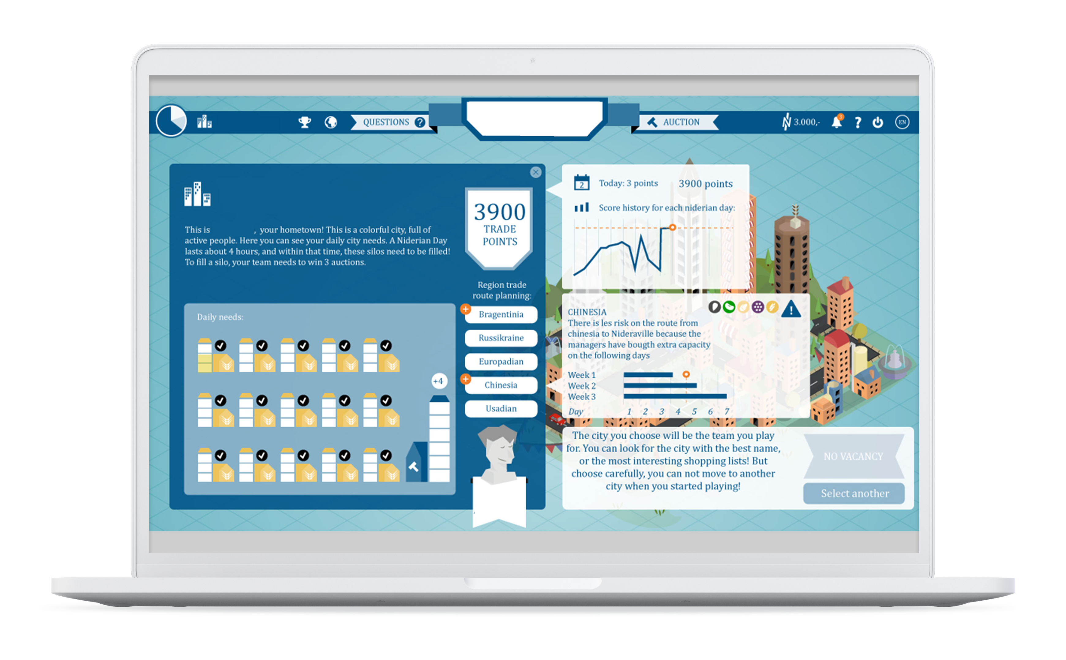 De game is op maat gemaakt voor Nidera, zodat het recht doet aan het idee van internationale handel. Handelsgoederen kunnen gekocht worden op een veiling en geld wordt verdiend door vragen te beantwoorden over allerlei relevante issues. Met het geld kunnen weer goederen gekocht worden, die worden verscheept naar verschillende wereldsteden. Een speler kan zo in het spel uiteindelijk de handel beheersen en beheerst daarnaast in de werkelijke wereld de gevraagde kennis.