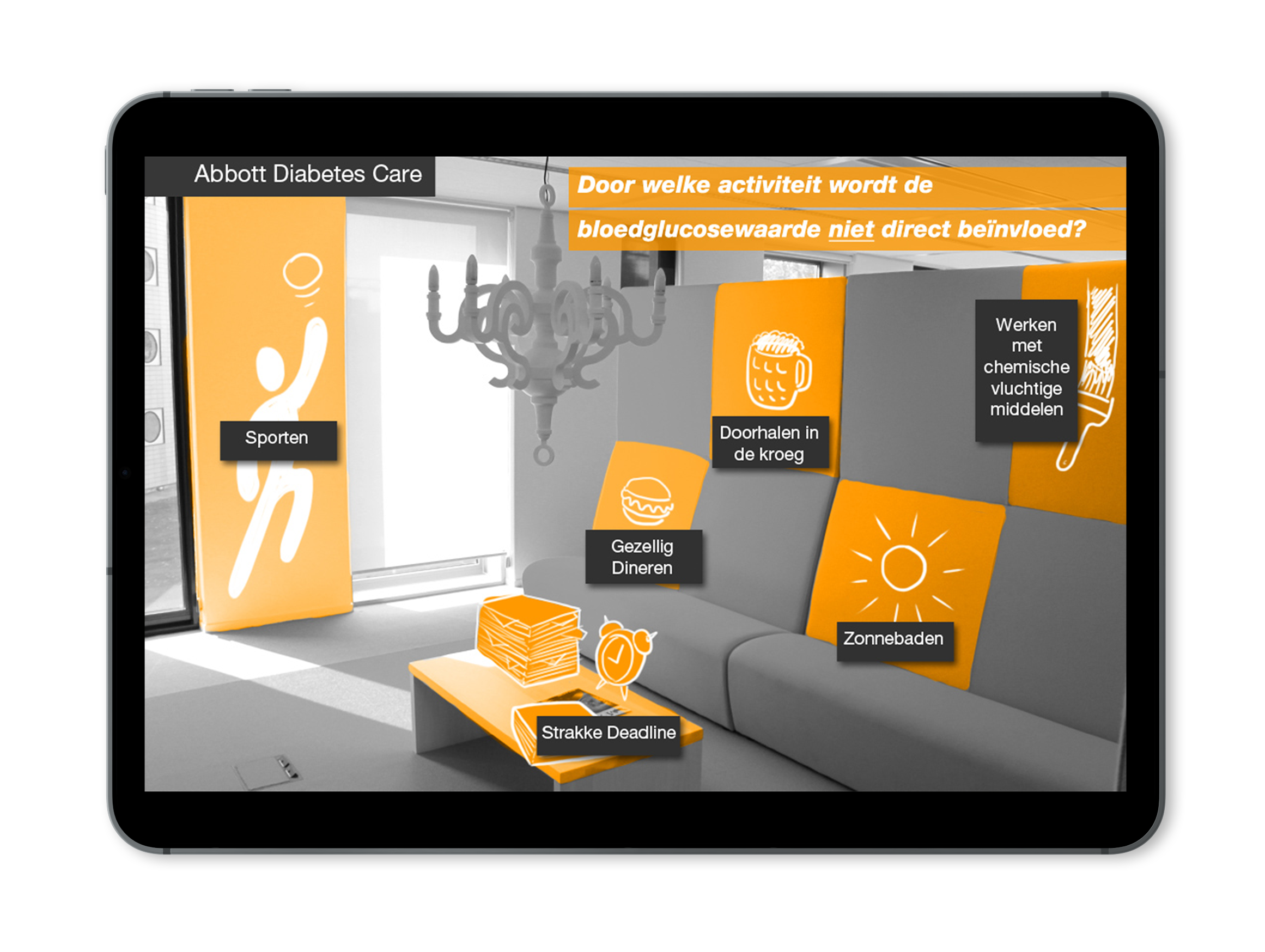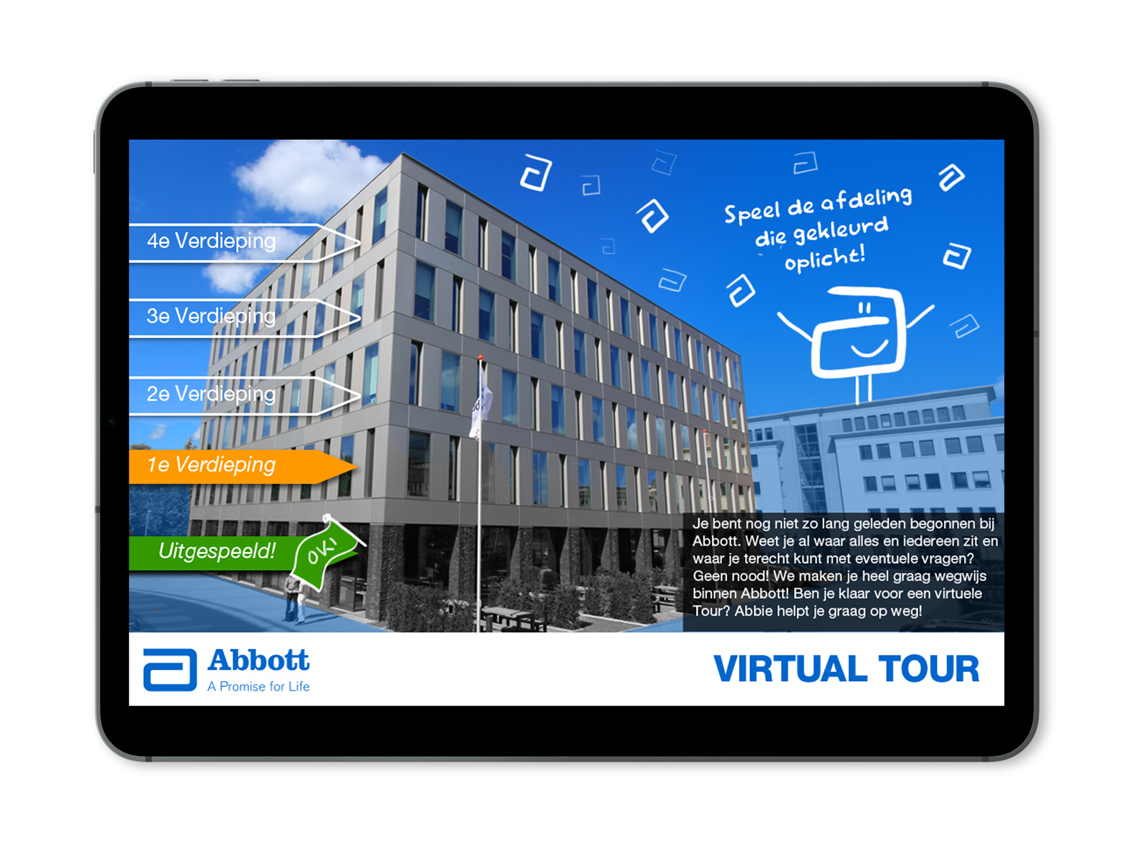 Voor het bedrijf Abbott hebben we een spel gemaakt voor nieuwe medewerkers. Deze nieuwe medewerkers moesten op een leuke manier kennis maken met regels, structuren, mensen en verschillende werklocaties. Belangrijk hierbij was dat het spel op ieder moment speelbaar was, zodat starters ongeacht de datum direct kennis konden maken met het bedrijf.